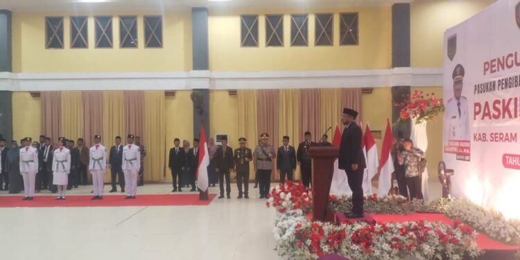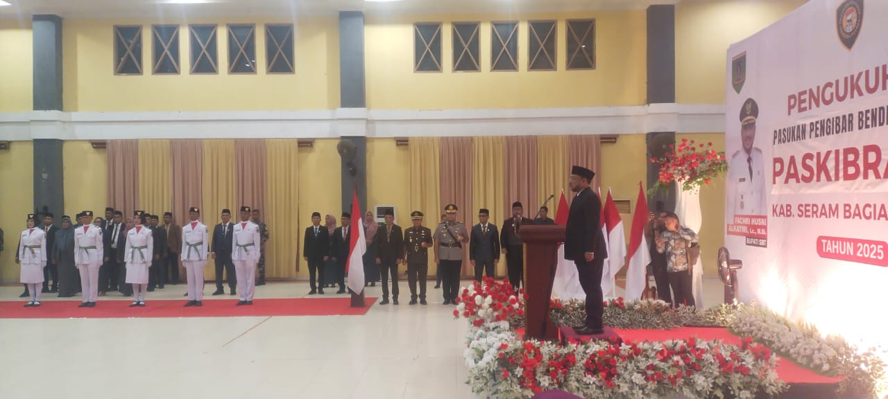 PORTALNUSAINA.COM,BULA-Bupati Seram Bagian Timur (SBT), Maluku Fachri Husni Alkatiri mengukuhkan 30 anggota Pasukan Pengibar Bendera Pusaka (Paskibraka) tahun 2025.