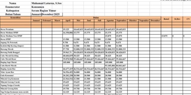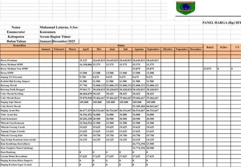 PORTALNUSAINA. COM, BULA-Pemerintah Kabupaten Seram Bagian Timur (SBT) memastikan harga pangan pokok di wilayahnya masih dalam kondisi stabil. Melalui Dinas Ketahanan Pangan, Pemkab SBT telah melakukan pemantauan rutin terhadap harga pangan di tingkat eceran selama bulan September 2025.